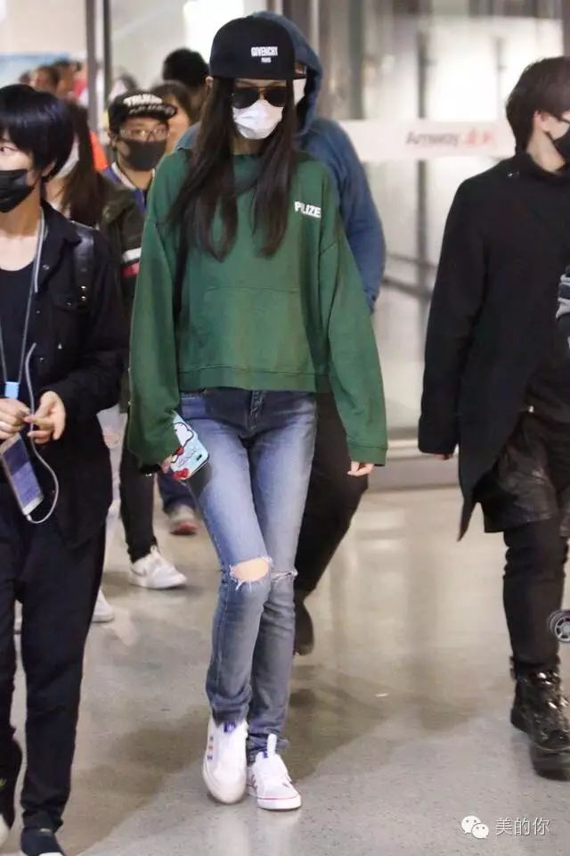 唐嫣用它搭配黑色棒球帽和破洞牛仔裤,就是一身舒适休闲的机场look。