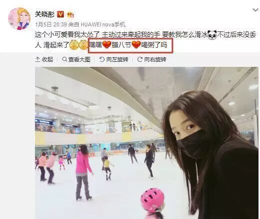 小花关晓彤也传出了绯闻,她同23岁的李宗霖共同晒出同一组滑冰场照片,还比了不少的爱心,虽之后也是辟谣说是“有工作合作”,但是还是不足以打消群众内心的疑惑!
