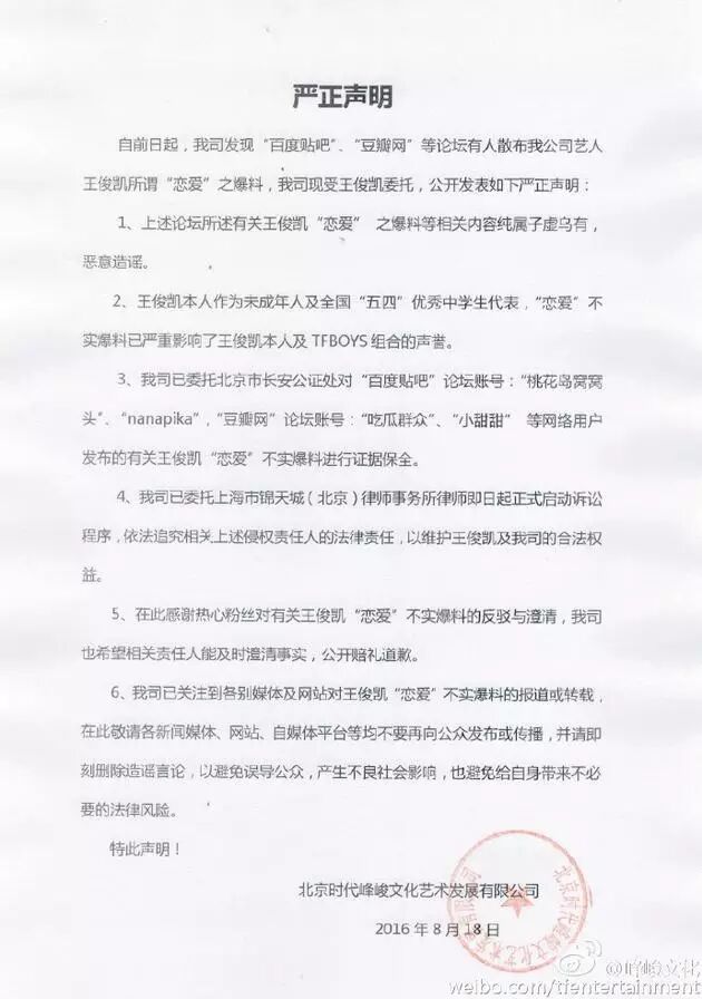 队友王源、易烊千玺也是各有各的绯闻女友,让公司更是借着王俊凯恋爱的事情,发了一份声明,表示三小只都还不是恋爱的年龄。