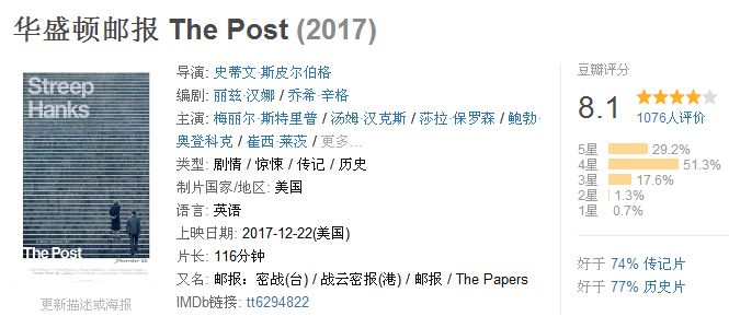 【豆瓣8.1分】本片聚焦1971年五角大楼泄密事件,汤姆·汉克斯扮演总编辑本·布拉德利,梅姨扮演发行人凯瑟琳·格雷厄姆 一天天长大 欧美男星 2018-01-24 21:49:21 312 创作不易,用心坚持,欢迎请BaGua喝几杯爱心咖啡!打赏并支持本文 打赏并删除本文 本片聚焦1971年五角大楼泄密事件。汤姆·汉克斯扮演《华盛顿邮报》总编辑本·布拉德利,梅姨扮演发行人凯瑟琳·格雷厄姆。凯瑟琳·格雷厄姆与本·巴格迪坎要赶在《纽约时报》之前揭露一件历经四届美国总统任期、长达三十余年的庞大掩盖事件。这两个人必须消弭他们之间的差异,各自拿他们的事业、甚至人身自由冒险,让长久以来埋藏在黑暗深处的真相重见光明。密码:atnx 创作不易,用心坚持,欢迎请BaGua喝几杯爱心咖啡!打赏并支持本文 打赏并删除本文 感谢您的支持鼓励,我会继续努力的!文章地址:用户邮箱:打赏金额:USDT 请输入数字点击”去打赏“,即可进行打赏支持本文章哦 汤姆汉克斯 About the Author 一天天长大 功能介绍:原 电影小哆啦 Related Posts 【最新完结】【韩剧】 张娜拉、崔振赫 等主演的爱情剧 2019-02-22 17:50:22 【经典】尼古拉斯·凯奇高分犯罪片,豆瓣评分8.1 2018-08-24 17:43:30 张若昀、马思纯、李现、刘敏涛、姜超 等主演的最新爱情喜剧 2018-05-25 00:07:49 周渝民、薛凯琪、郑中基 等主演的爱情喜剧 2018-05-14 23:06:53 宫崎骏动画系列合集 2018-03-21 19:18:52 发表评论
