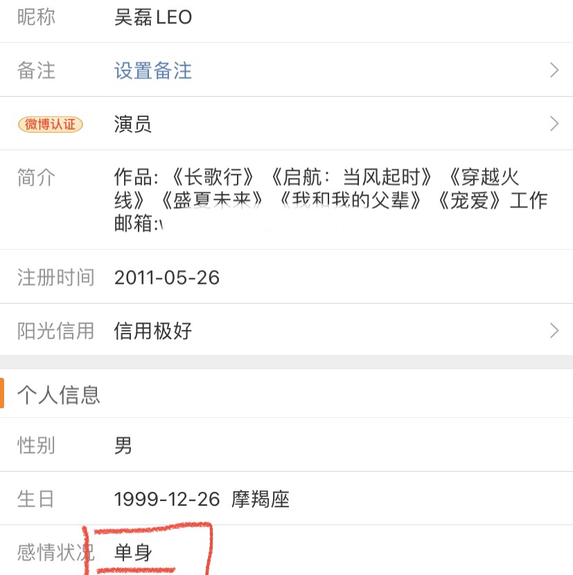 有网友发现吴磊的微博简介个人信息里对感情状况中写的是单身,于是大家都在说吴磊这是在故意手拆和赵露思的cp。结果cp粉看到简介后,又狂欢了,还说吴磊和赵露思都是单身,这样他们谈恋爱的几率就更大了。