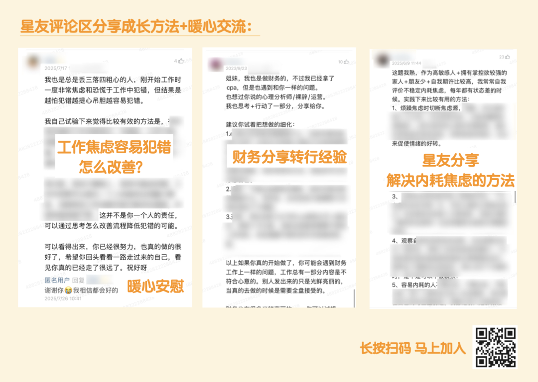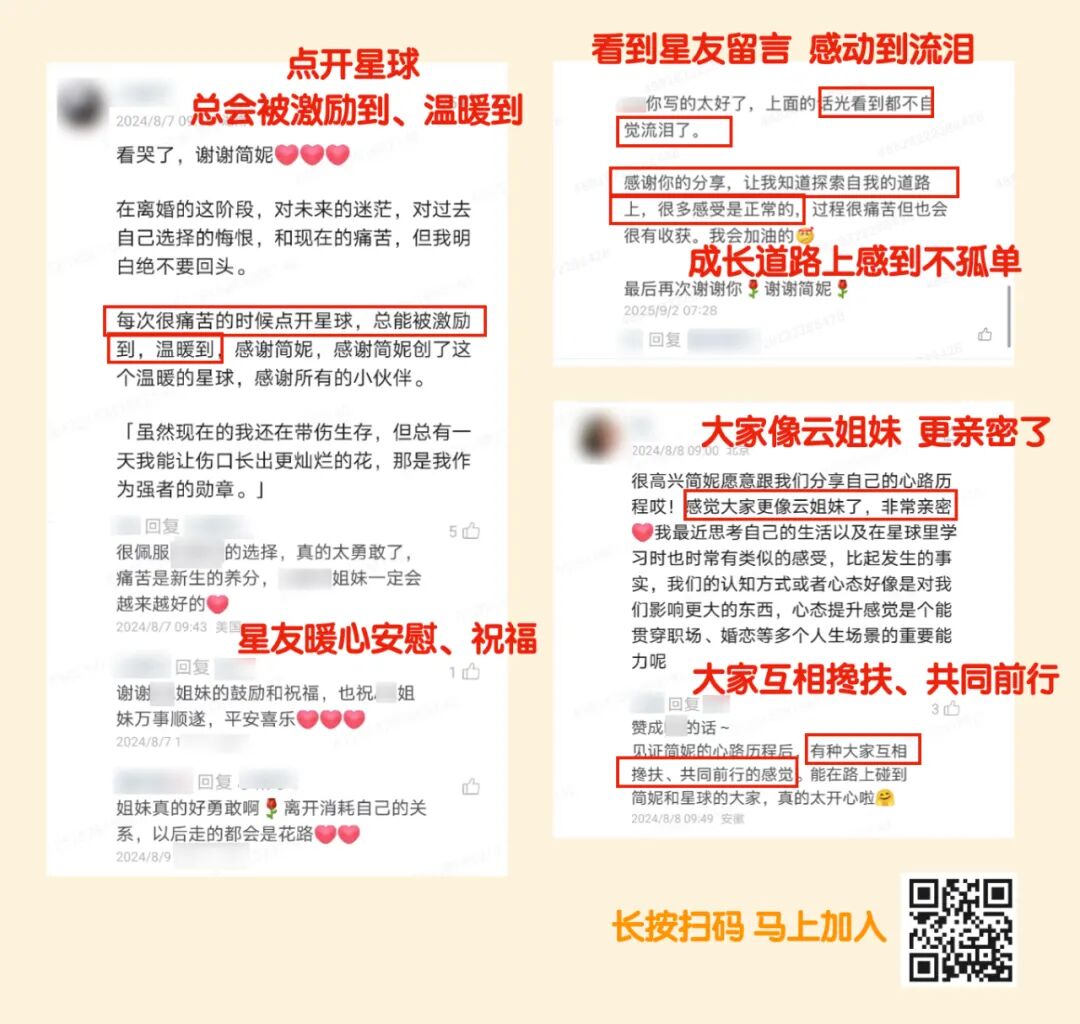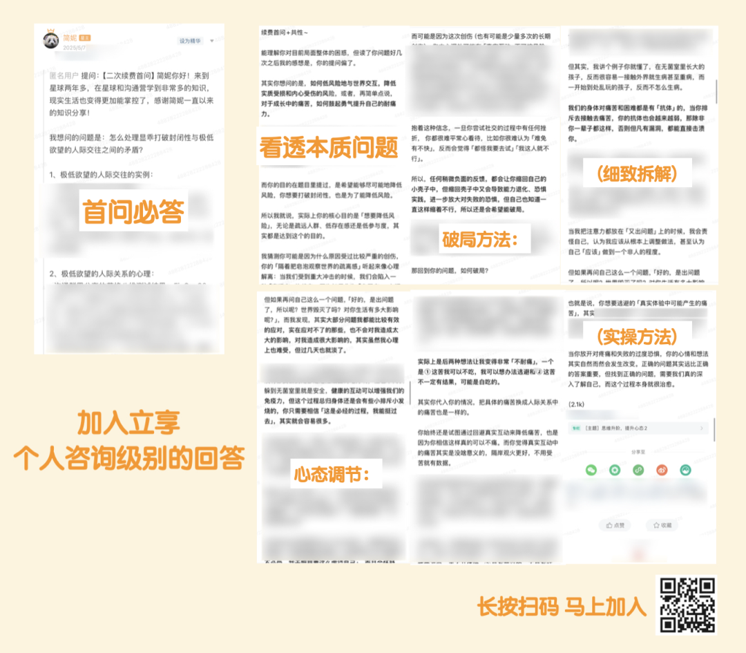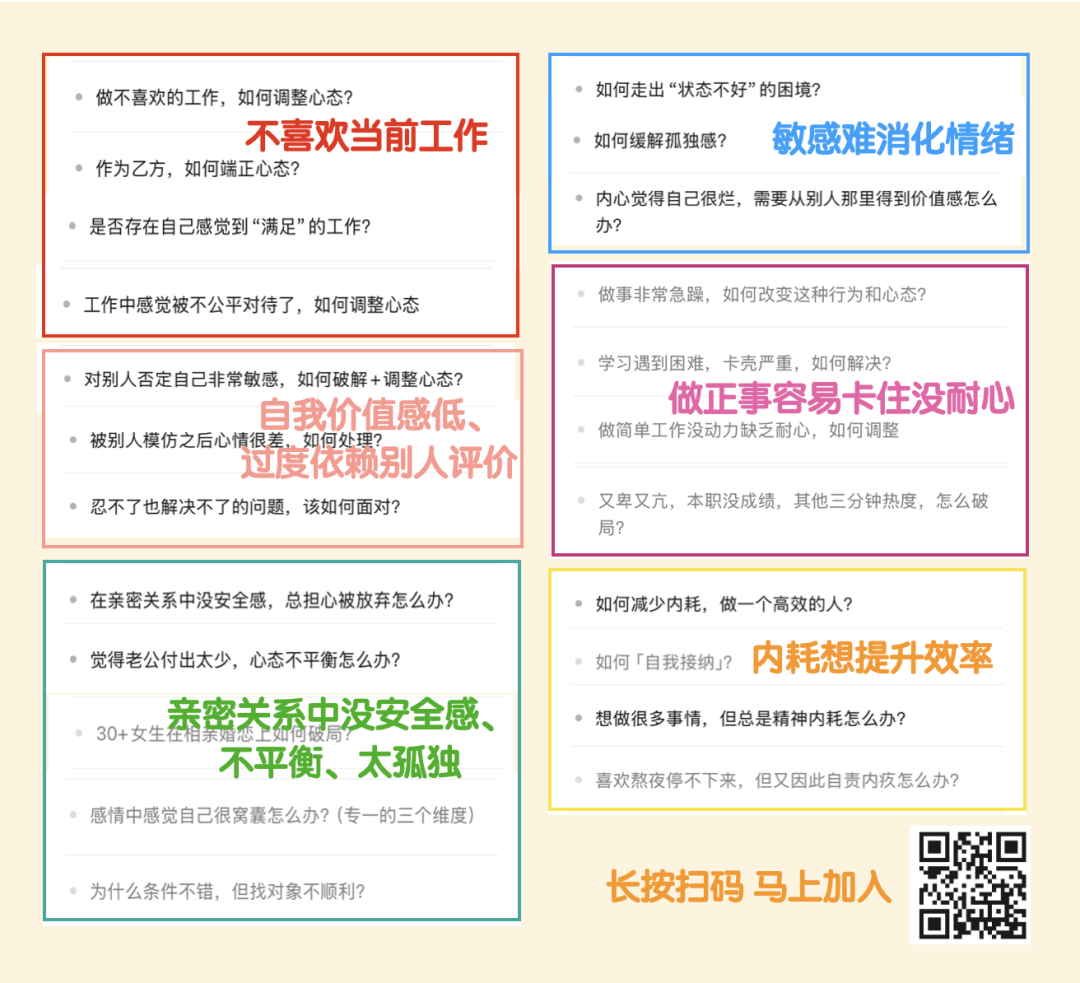 无论你是「想很多做不了决定」「总是内耗无法破局」「躺不平卷不动不知咋做」,还是「想改变但不知道咋改」「遇到挫折难以消化」「内心痛苦无法缓解」,星球都有点对点梳通卡点的内容: