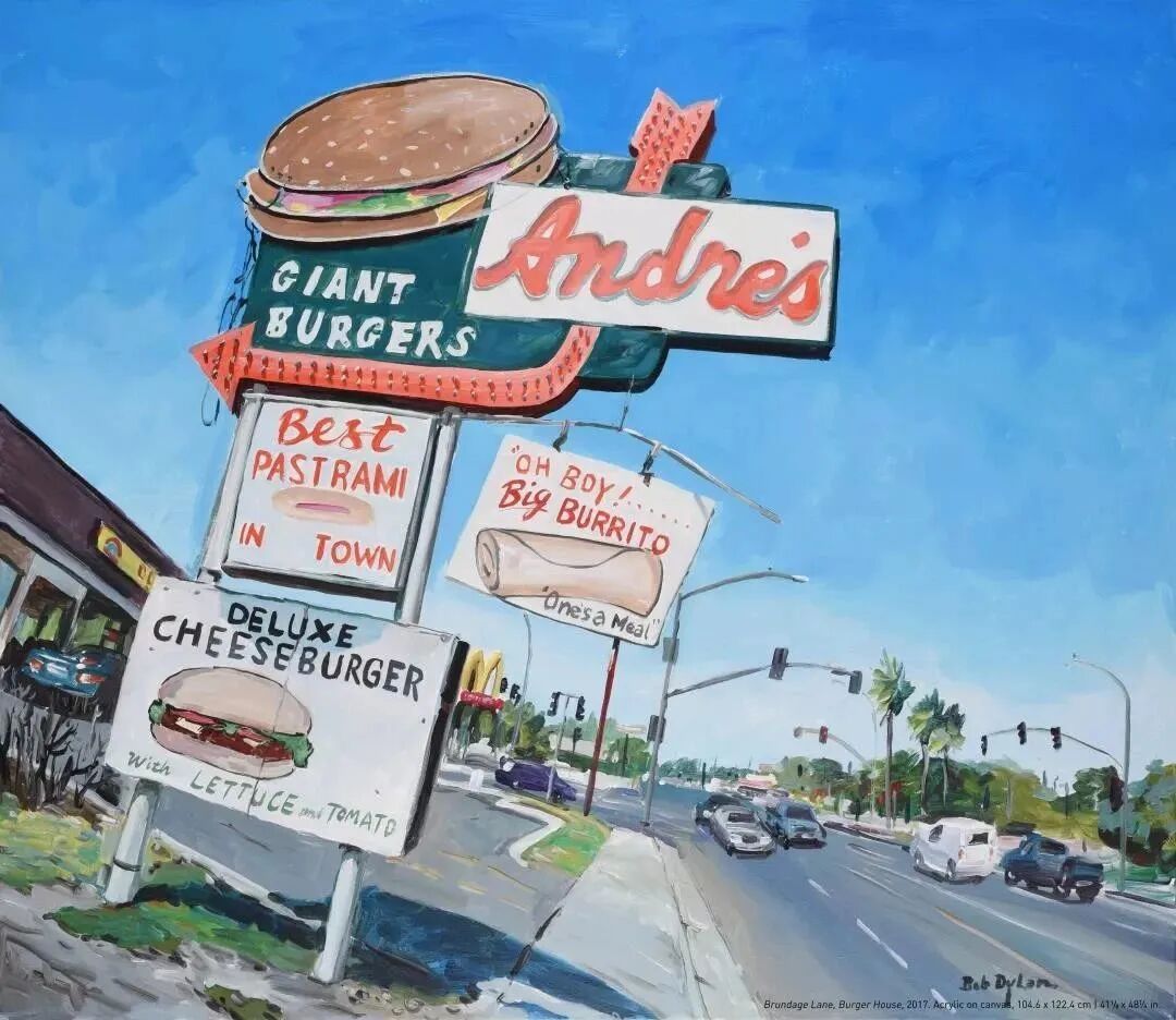 在无数个奔波巡演的日子里,美国的公路组成迪伦生活的重要部分,他就拿起画笔,反复描绘这个国家的公路、城中街道和偏僻小径。画的意境无不在回应他1963年创作的那首歌曲《明天太遥远》: