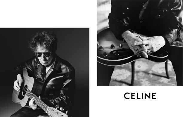 六十年过去了,他的肖像再次作为摄影师镜头下呈现时尚的摄影主题。2022年,Celine的创意总监艾迪·斯理曼找到迪伦,就像上世纪60年代的照片风格一样,斯里曼的肖像让迪伦保持了他一贯的神秘特质。他穿着一件经典的Celine皮夹克,眼睛隐藏在深色墨镜后面,表情平淡。看似什么都没有透露,但无法掩饰的是他在镜头前的轻松。
