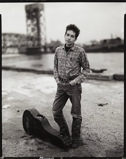 同年,在摄影师理查德·阿维顿的镜头下,迪伦穿着格子衬衫和破旧的牛仔裤,站在离纽约东河不远的地方摆姿势。他用一个破旧的吉他盒作为道具,凝视着相机镜头,脸上挂着有些莫测的笑容。这幅明胶银盐肖像,在2014年拍卖会上以62500美元的价格售出。
