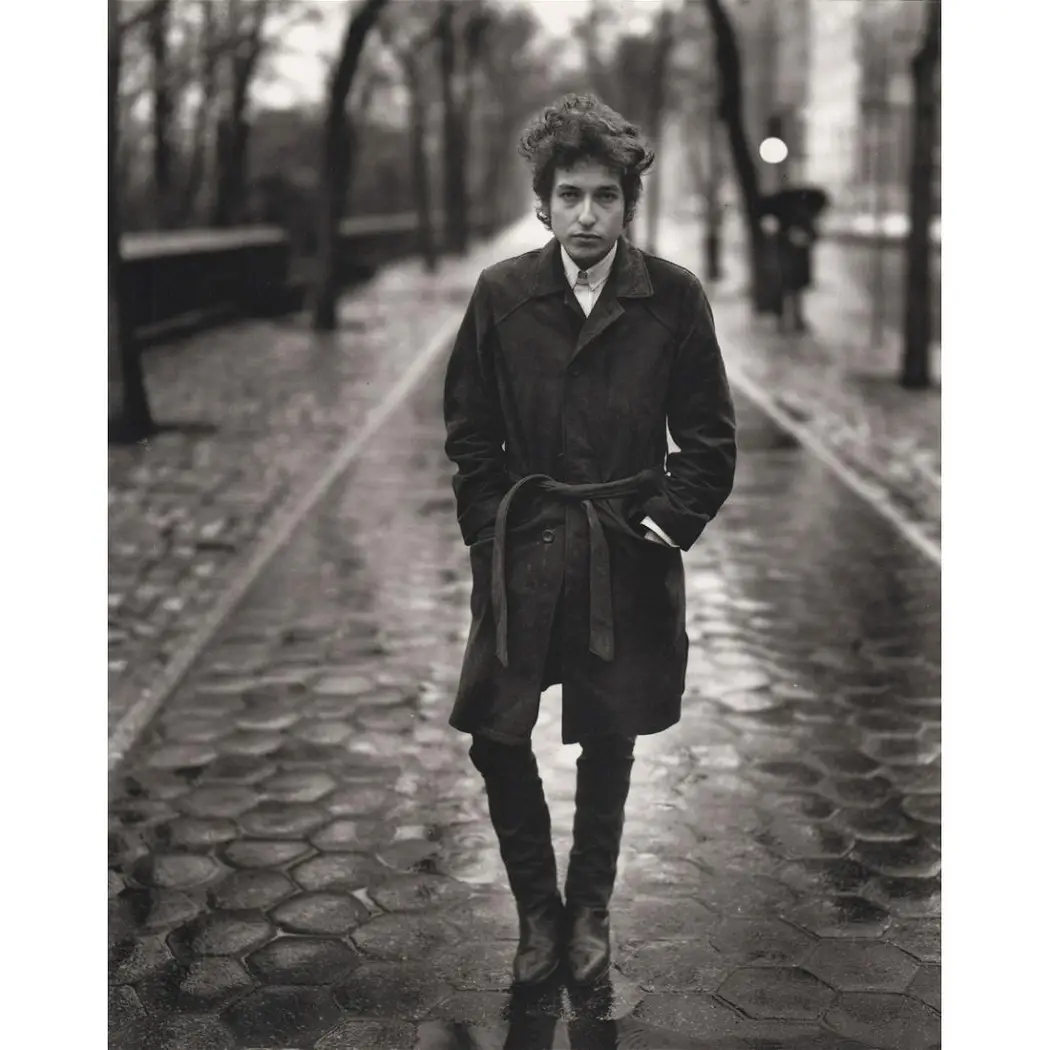 1965年,鲍勃·迪伦站在中央公园第五大道一条下雨的人行道上,阿维顿为《时尚芭莎》再次给他拍摄肖像。这位歌手穿着黑色腰带大衣和尖头靴,头发狂野,雌雄同体的风格,现在看来也很时髦。