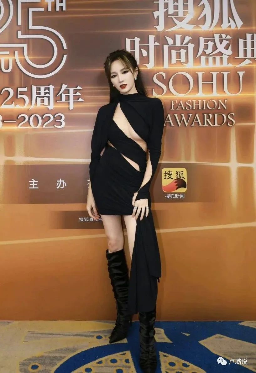 穿“姐妹装”的还有孟佳,礼服不能说一模一样,至少设计想法是一致的,都是在全黑的套装上通过镂空增加性感度。