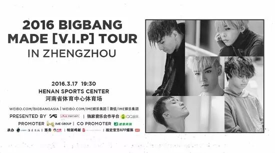 BIGBANG 2016-郑州站 演出场馆:河南省体育中心体育场 演出时间:2016年3月17日 19:30