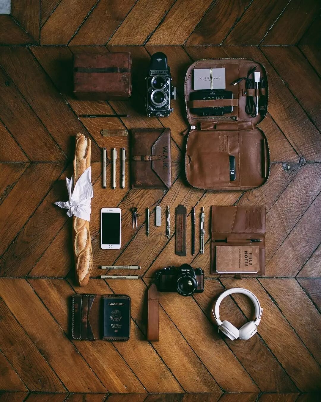 由他精选出的雨衣、风衣、皮夹、相机……
