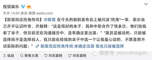姚笛的回应是:不认识叶青,本子是中影电视剧那边给的,自己也是被挑选的,还没确定是不是会出演。