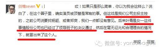 他在跟网友对话中说叶青是公司主控、主投资的,领导班子通过了,但毫无理由就冒出了姚笛当女一号。