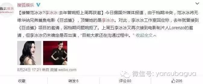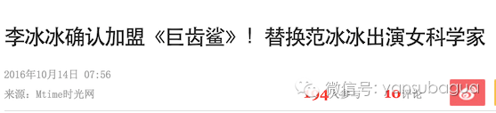 最终10月出了李冰冰确定出演的新闻,标题还是“李冰冰替换范冰冰”的噱头,这也没办法,毕竟这样讲,看上去吸引点击率。