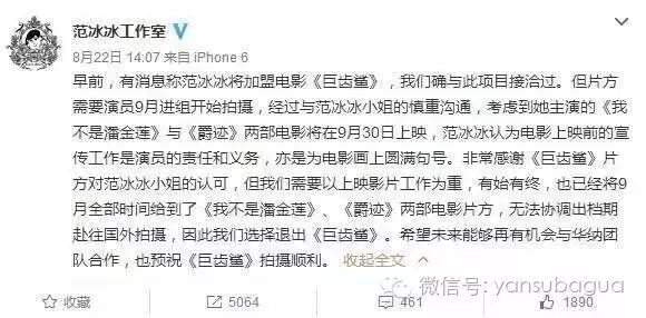 范冰冰工作室8月就说档期有问题放弃《巨齿鲨》。