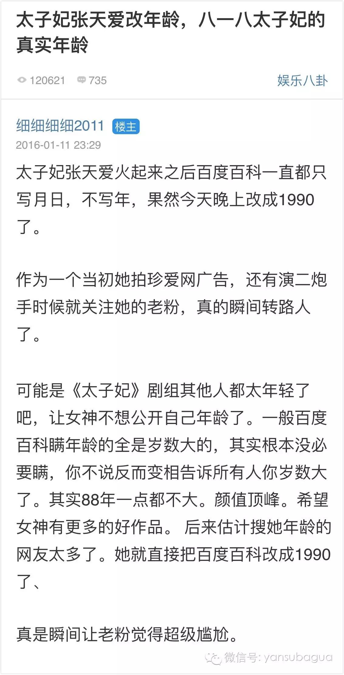 至于张天爱改年龄这个料她刚走红就有人挖了,天涯的帖子还是老粉发出来的,说记得她原来88年现在改90年。