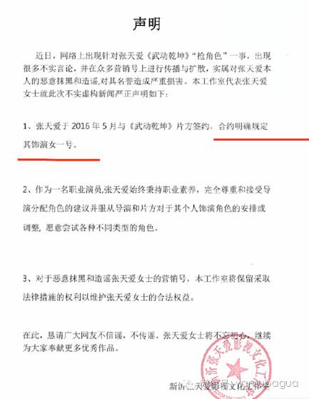 更引发反感的是张天爱工作室今天发的声明里,第一条是“合约明确规定张天爱饰演女一号”。