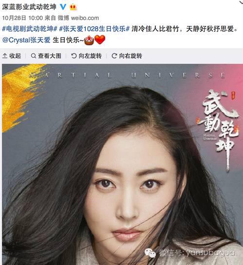 看《武动乾坤》的微博,给张天爱送生日祝福的时候,文案还是配合着绫清竹来的。