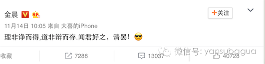 金晨昨天发微博如下:理非诤而得,道非辩而存。闻君好之,请罢!