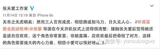 两小时后剧方的微博又表态了,曰导演张黎在开机仪式上说了接触张天爱之后觉得应欢欢更适合她,“非她莫属”。张天爱工作室不知怎么就被带成古文节奏了,继续拽文说三人成虎,日久见人心等等。
