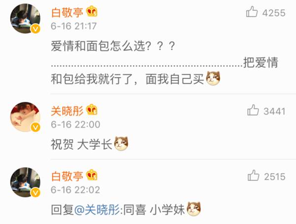 白敬亭毕业发了一条微博,关晓彤在评论里和白敬亭互动,一种两个人小世界,别人插不进去的感觉,而且冷漠狗表情,他们俩真的太爱用了!