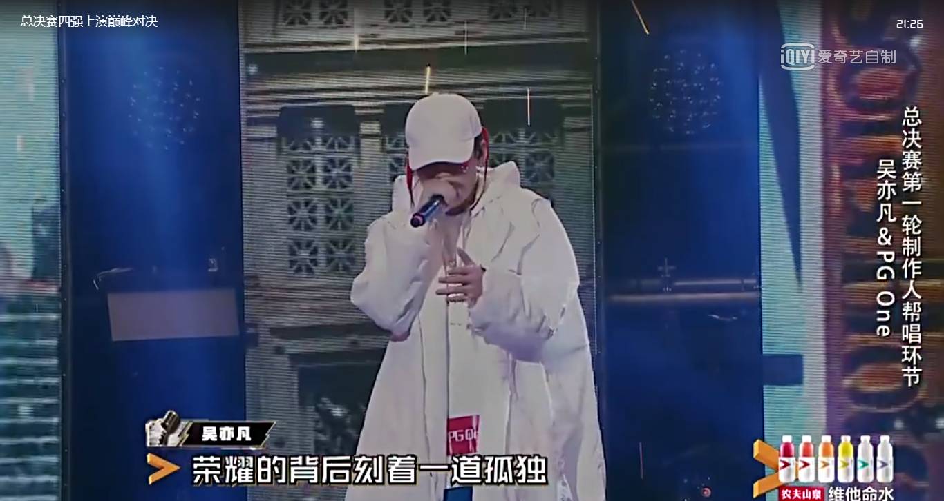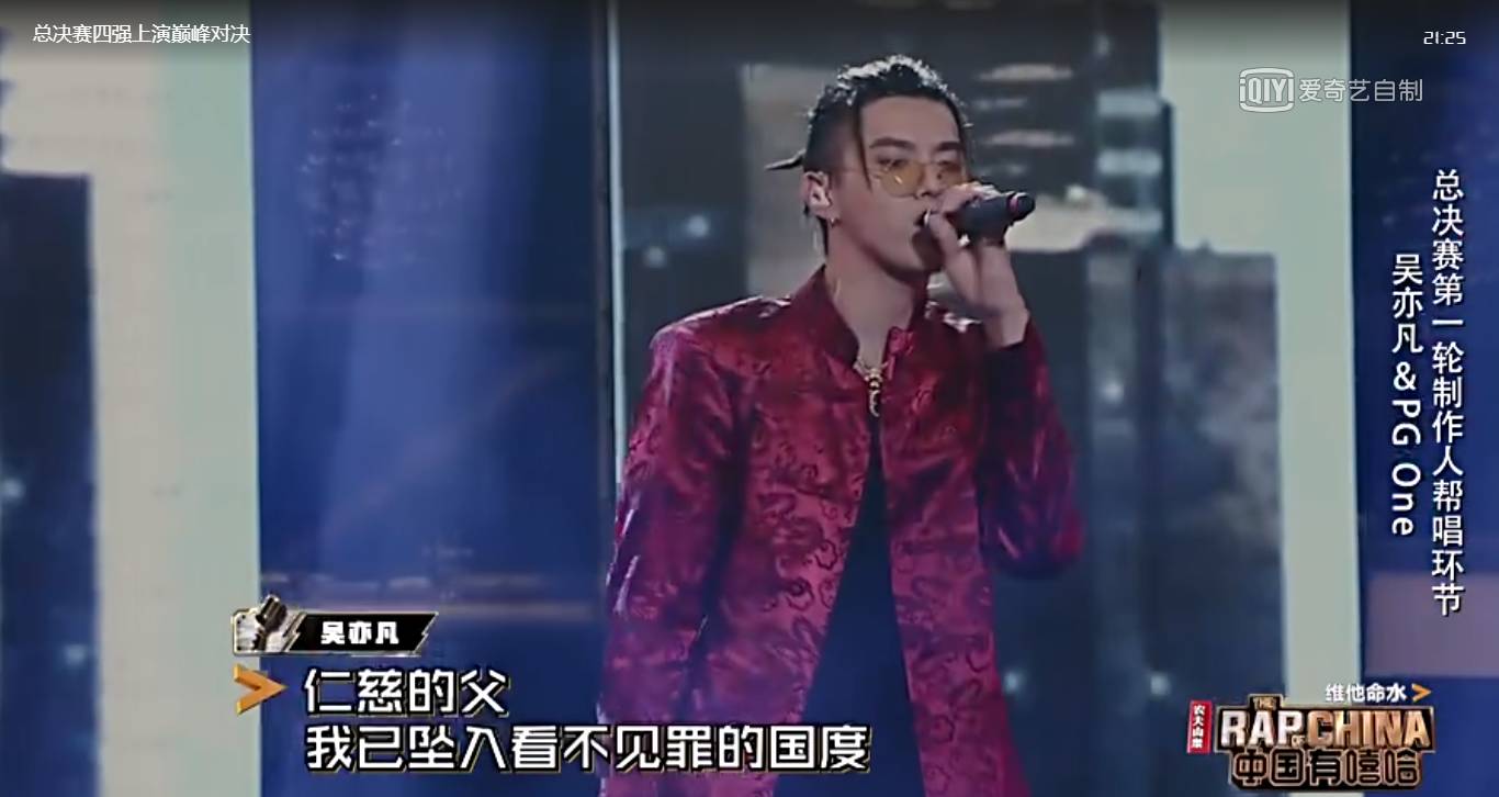 今晚的决赛,吴亦凡带着双料冠军之一PG ONE唱了首《以父之名》,这可是华语乐坛的说唱标杆,敢挑战也是蛮有胆量的。