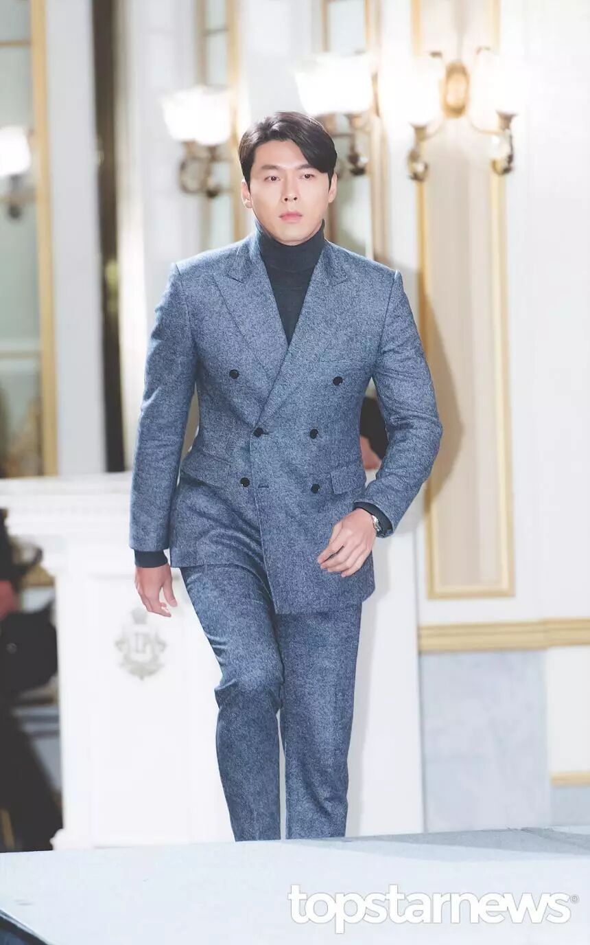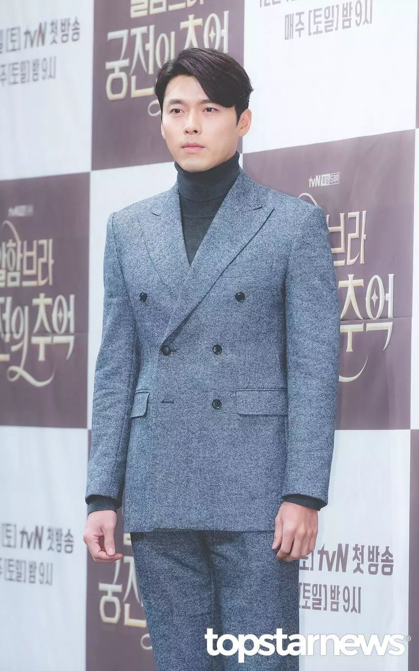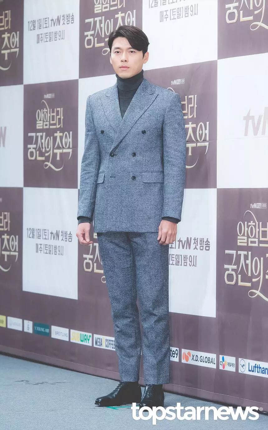 玄彬身穿灰色西装套装内搭一件高领毛衣