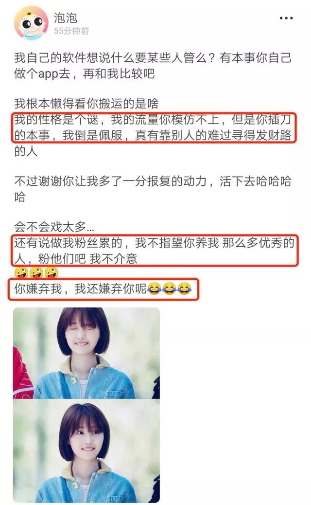 后来不忍网络暴力的她,在微博上开了一个小号和网友对骂,却又被炮轰“放飞自我”、“精神有问题”,一路以来就是承受着这样的流言蜚语到了现在。