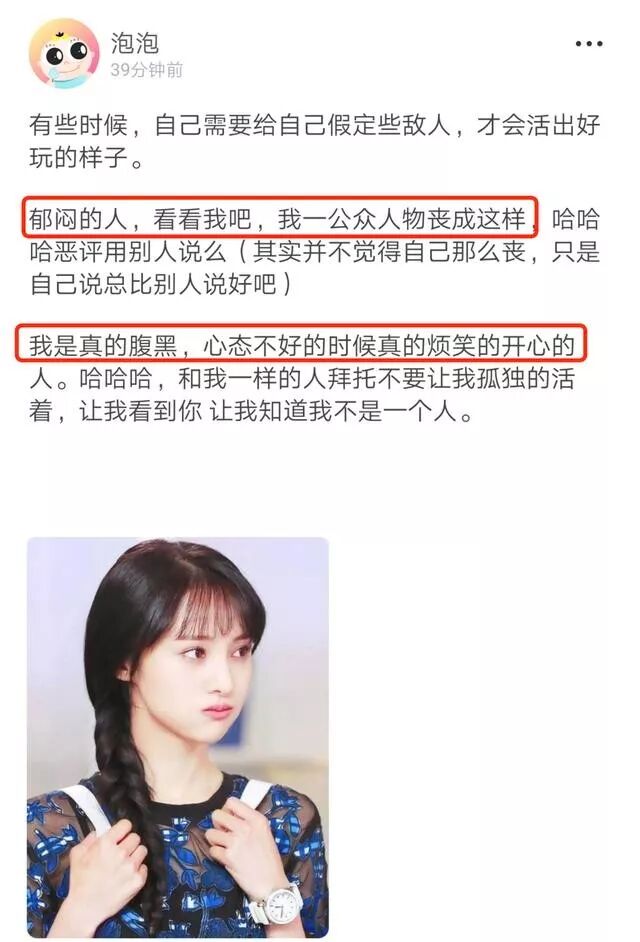 她还会在上面调侃自黑,我是个很腹黑的人,心态不好的时候,就很烦那些笑得很开心的人!