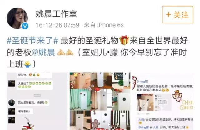 姚晨去年年底在北京雾霾最严重的时候为工作室的每一个人都发放了空气净化器,当做圣诞礼物,十分暖心。