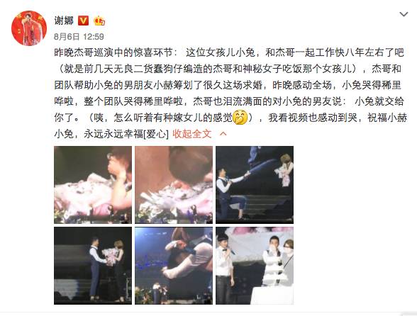 张杰近日在演唱会上帮其助理小兔的男友秘密策划了一场求婚,场面十分浪漫,随后谢娜发微博祝福,可以说是很幸福了。