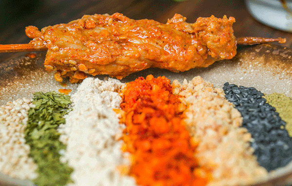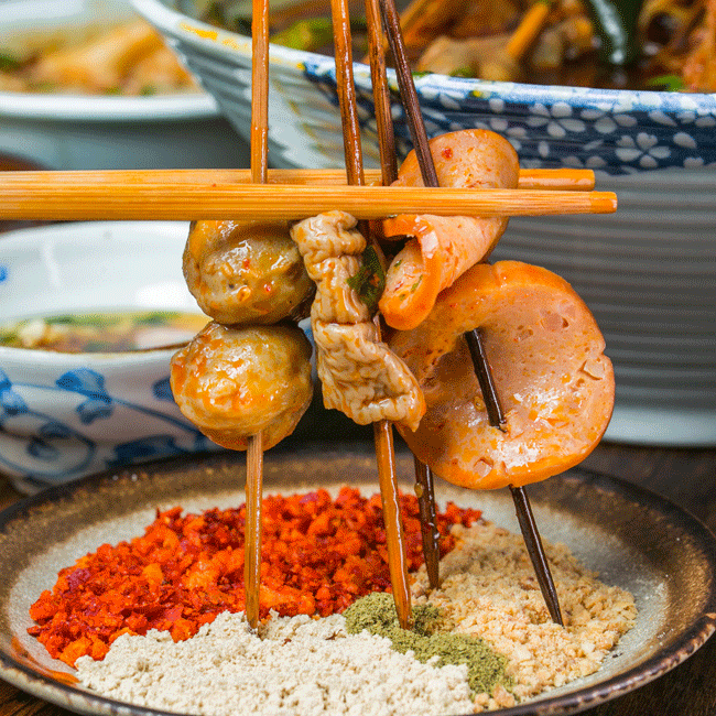店里秘制的油碟和七彩干碟,颜值也是逆天高!七彩干碟又被爱称为彩虹碟,将黄豆粉、辣椒面、花椒粉、花生粉……搅拌在一起,蘸着串串吃,每一口味道都很惊喜!