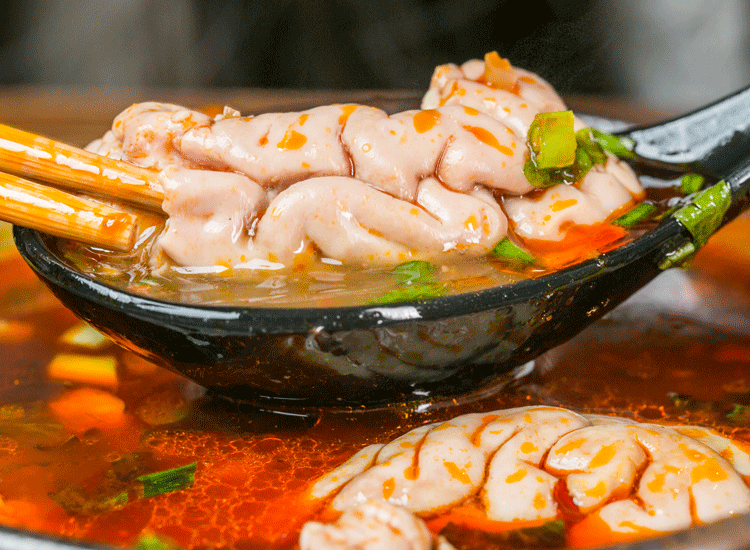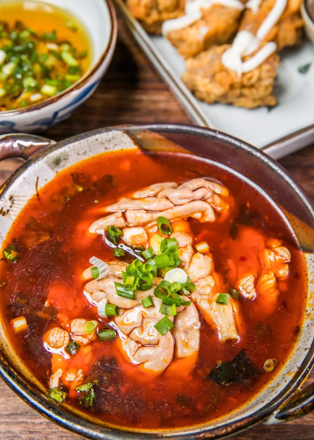 每日新鲜运来的猪脑,一点腥味都没有,而且直供当天销售,配上红到反光的辣汤,光闻味道就被俘虏了!