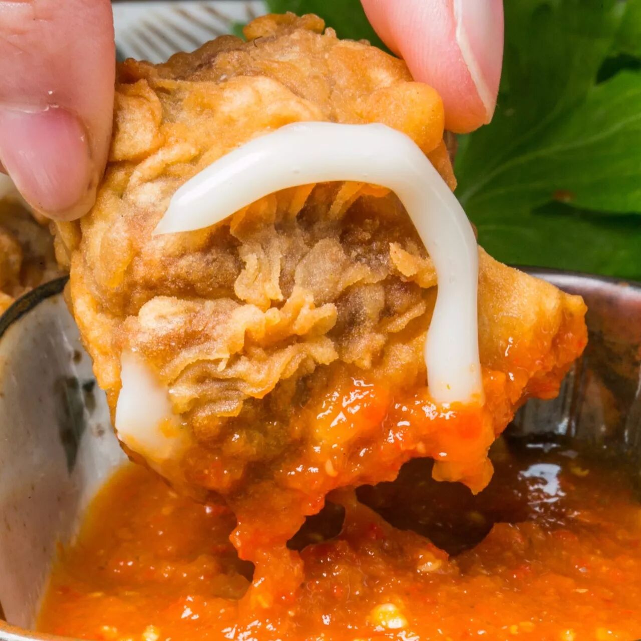 油炸脑花外表像鸡米花,但小编觉得更像是炸鲜奶,外脆里嫩。配的酱汁是甜辣酱,不仅解腻还丰富了口感~