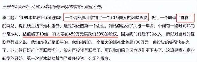 1999年,李亚鹏已经在娱乐圈小有名气。一个偶然的机会,他拉来不少投资投进了一家婚庆网站里,运作一番后网站估值竟然高达450万。在1999年,450万几乎是个天文数字。
