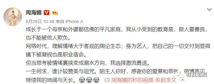 但是就是在8月28日,周海媚突然宣布退出微博,看她里面写的东西,很明显可以看得出来她对于一些动不动就恶语相向的网友腻了,现在很多人不知道是怎么了,容易把作品角色与演员本身做等号,其实这是非常愚蠢的,对艺人也是非常不公平的,本来出演坏人就背负了一些压力,回头还要无缘无故被你们骂,谁能受得了,比如之前《延禧攻略》的顺嫔张嘉倪就果断给怂回去了,比如袁春望的扮演者王茂蕾 就选择关闭评论,等等这些都是一大批网友无缘无故就把演员当成剧中角色去发泄自己的情绪了。