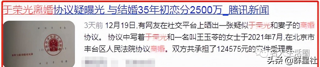 在去年底于荣光被爆出离婚时,大家还是比较惊讶的,原因是他与妻子王玉苓已经做了35年的夫妻,并且离婚时是在法庭协议离婚,按理说和平离婚不至于闹到这么僵,最后的判决结果是家产对半分,王玉苓分得2500千万的高额财产,这样的结果令很多人感到一阵唏嘘,风风雨雨的三十多年终究还是不敌一纸离婚书,其实在这之前就有网友透露,在公共场合时他们一家人游玩夫妻俩全程几乎零交流,那时候就有人预判两人离婚只是时间问题。