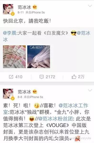 接着我们来看看2014年8月份开始,范冰冰和李晨在微博上的互动