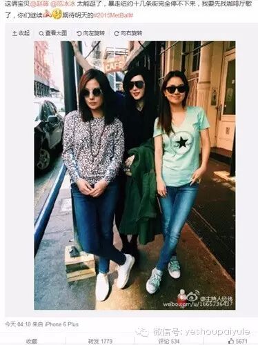 到了5月份,经纬在微博发了她和赵薇、范冰冰一组合影,原来她们在纽约街头暴走