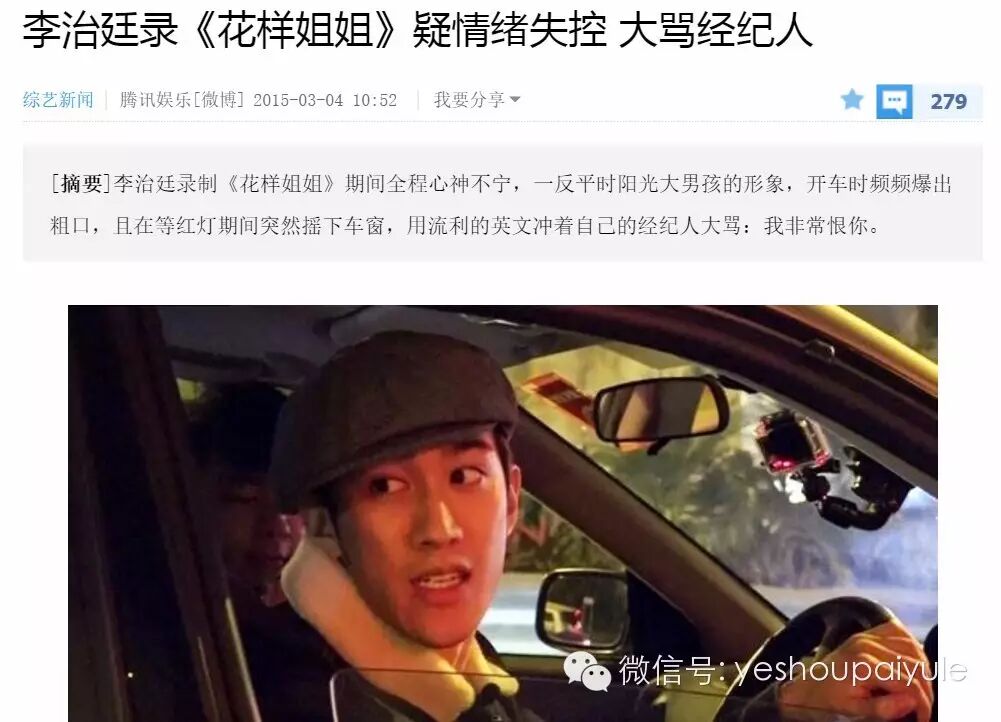 而反观李治廷,在2015年2月录制《花样姐姐》的时候,却被爆出现场失控发飙、怒骂经纪人的新闻,当时媒体已经质疑:是不是范冰冰恋情激怒了他?