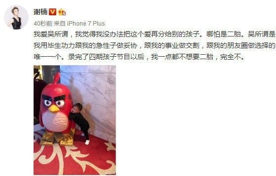 前两日,谢楠在微博上分享了儿子吴所谓的近照,并且坦言自己很爱儿子吴所谓,并且没有办法把这份爱分给别的孩子,包括二胎。
