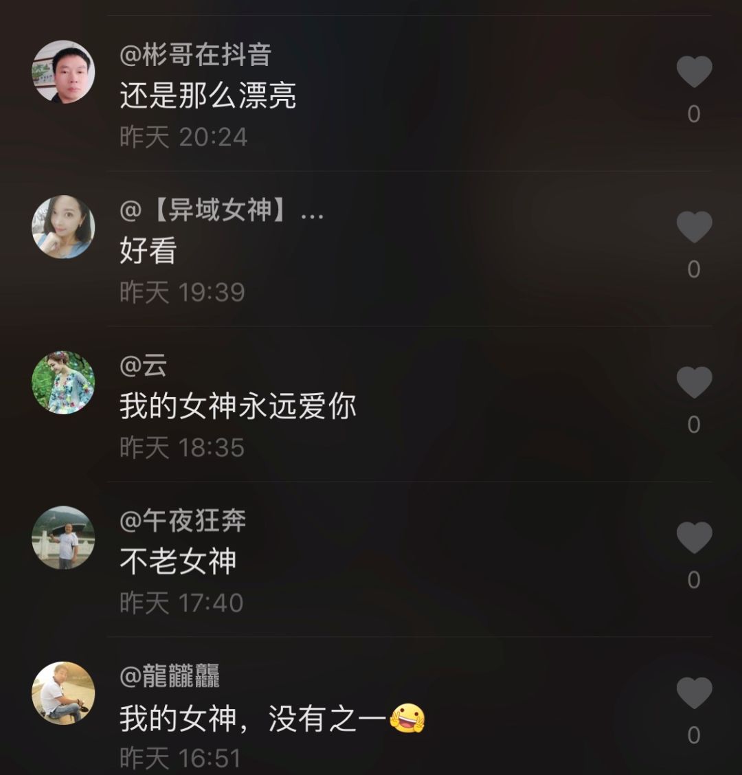 不一会儿,视频底下就会出现许多留言。这些夸赞通常呈现出一种趋同性。例如女神、童年、不老这几个词出现的频率极高,几乎所有人都会用到。