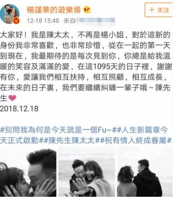 这在娱乐圈也很少见。虽然他们年纪大到可以结婚,但他们仍然童心未泯。这是件好事。在微博上,她高兴地对粉丝们说,我现在是陈太太了,所以不要再叫我杨小姐了。很多网友说这太甜了,这一波狗粮真的无话可说!然而第二天,热搜列表的风格突然发生了变化,都说她成为了第三者,插足现任丈夫的婚姻。这让网友们大吃一惊,她这是幸福来的太快,悲催的事情来的也太快了吧!