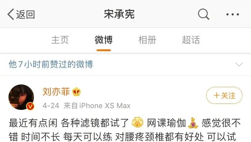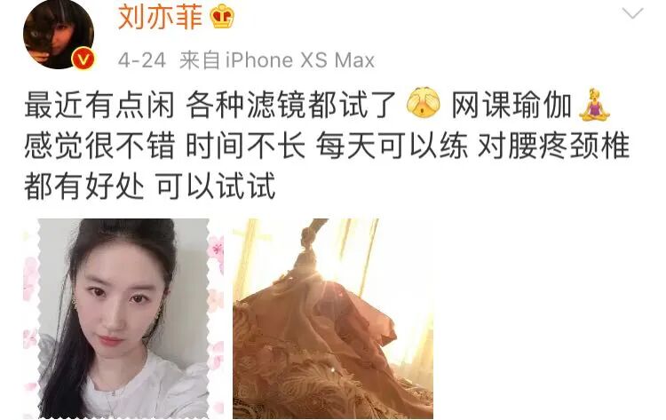刘亦菲最近不是有点闲嘛,说是在家各种滤镜都试了,还上了网课瑜伽,感觉很不错,每天练对腰疼颈椎都有好处,还推荐给大家试试。