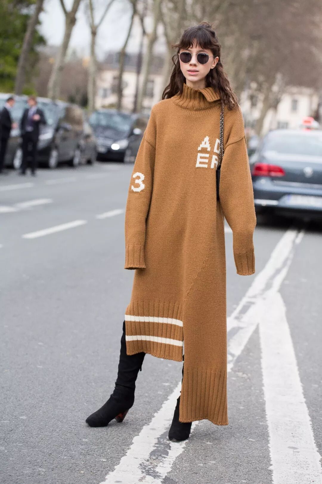 如果还是觉得单穿针织裙怕臀部显胖,也可以把它藏在宽松针织裙里叠穿,露出小腿最细处,不再臃肿。