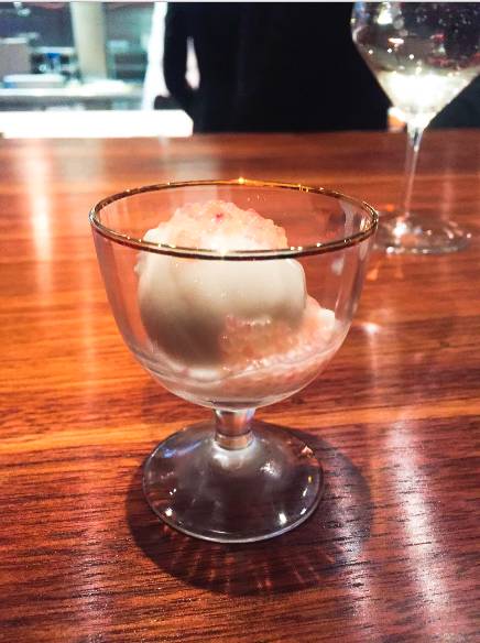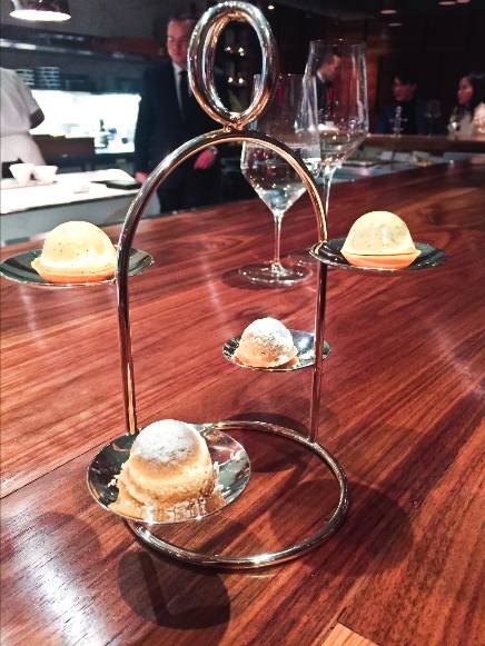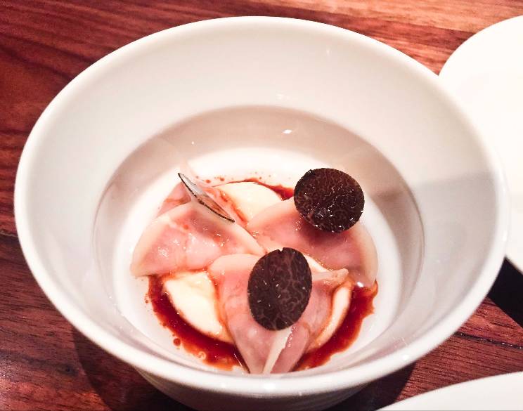16年底Chefs Table 曼哈顿店试营业,秦大侠有幸成为了新店迎来的第一批客人。没有招牌和指示的老店本来就难找,新店直接把入口设在了高端超市Brooklyn Fare 内部,连独立的出入口都免了。身穿礼服的客人们需穿过超市的货架才能达餐厅。与老店狭小的印象和纯金属的摆设不同,新店以暖色调,台面也是木头做成,台面后厨房区的上方依旧吊满铜色的锅群。保持了总店的风格,又让人感受到分店的努力。