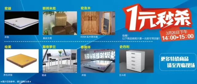 3月26日下午14-15点,顾客凭秒杀券,在规定时间内即可参加“1元秒杀家具”活动。(办公家具不参与活动)