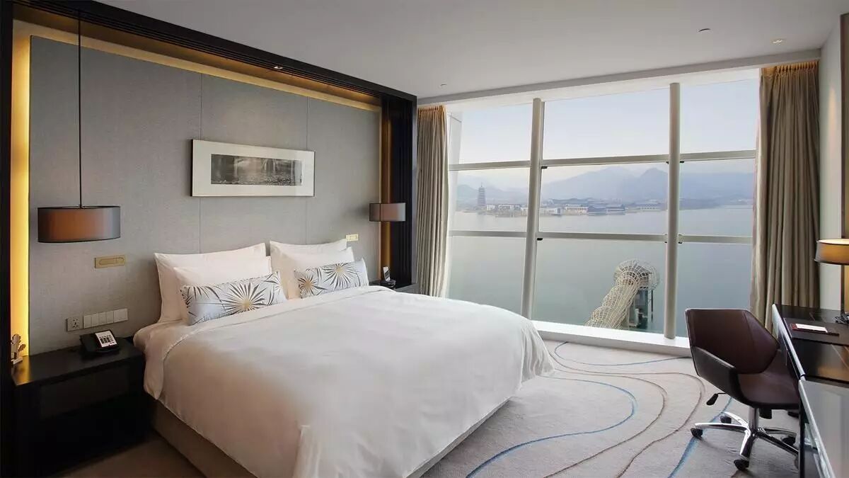 推开房门插上门卡的一刻,窗帘自动拉开,山湖景色尽收眼底。靠在窗边的沙发上,听听音乐、看看书,在美景面前悠闲地度过一个下午。