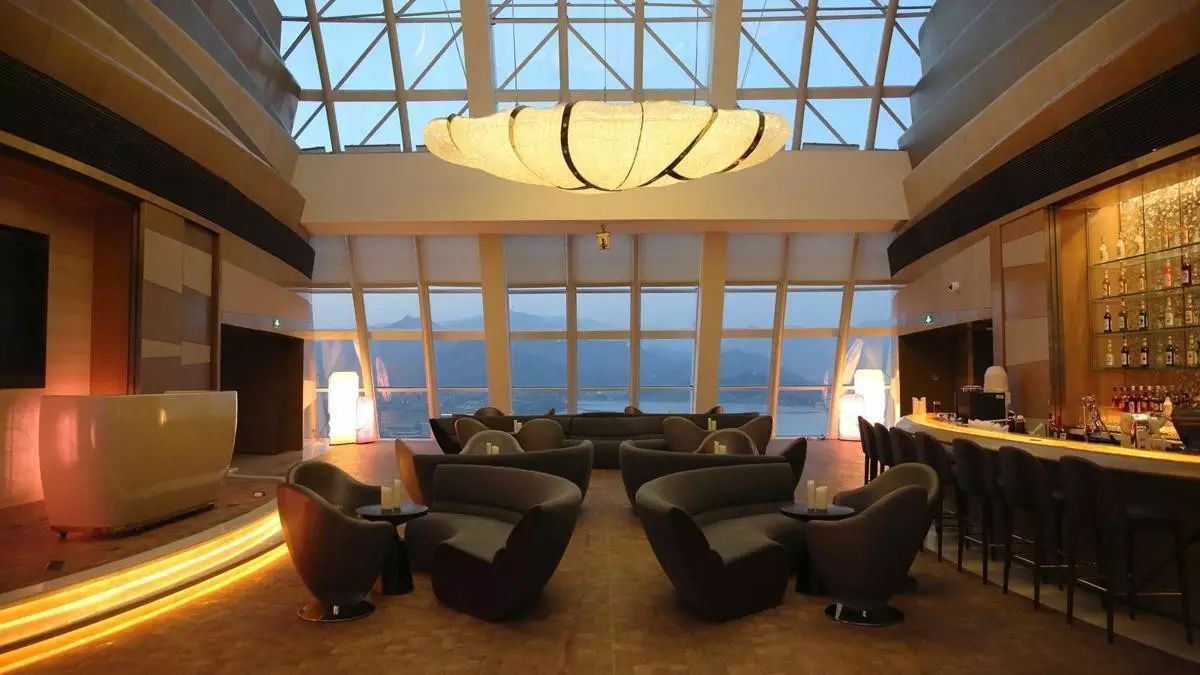 酒店最顶层(即圆球顶端)是怡景酒吧,酒吧一侧可以看到湖景一侧是城景,悬挂在空中如祥云的灯饰全是施华洛世奇水晶打造,灯打开的一瞬间,无不惊艳。酒吧里拥有和酒店同名的鸡尾酒,Sunrise,橙红的圆形冰块漂浮在鸡尾酒上,很生动。