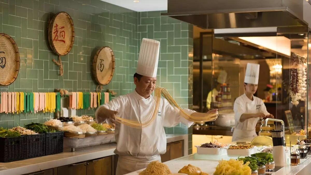 北京日出东方凯宾斯基拥有三间风格迥异的主题餐厅,位于2楼的兰香阁提供正宗的中餐,主要提供淮阳、四川、广东和北京的美食佳肴。餐厅的地毯设计以及点餐区的圆桌和餐椅都暗含了中国元素,营造出简约现代的装饰风格。