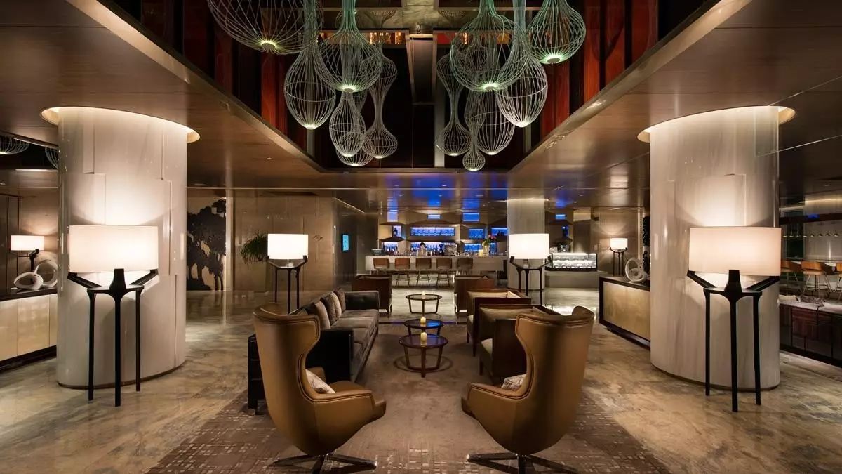 大堂酒廊紧邻大堂,位于中餐厅下方,其主要设计特色是自上而下的形状奇异的有机饰物。这些悬挂设计被捆绑在一起做出不同的形状并内置光纤。照明的效果使它们活灵活现,其色彩随着昼夜交替而不断变化。