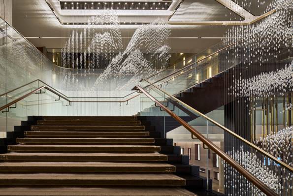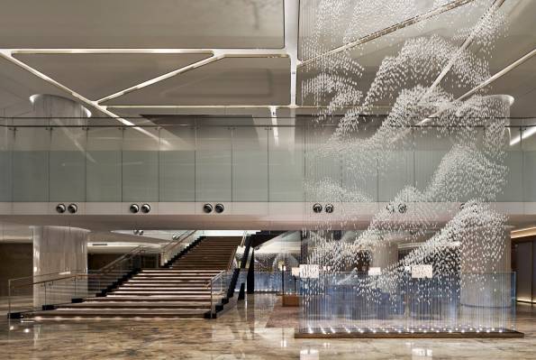 每一组玻璃悬挂设计被刻意分置于大堂的前后空间,层层叠叠,从不同角度欣赏都能收获一幅山水美景,创造出独一无二的视觉效果。